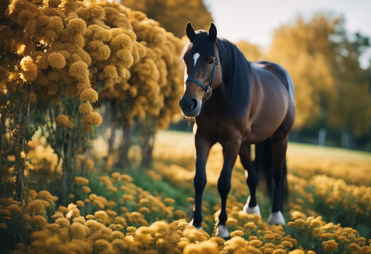 En hest som beiter nær en klynge av giftige planter, med visne blader og lyse, fargerike blomster