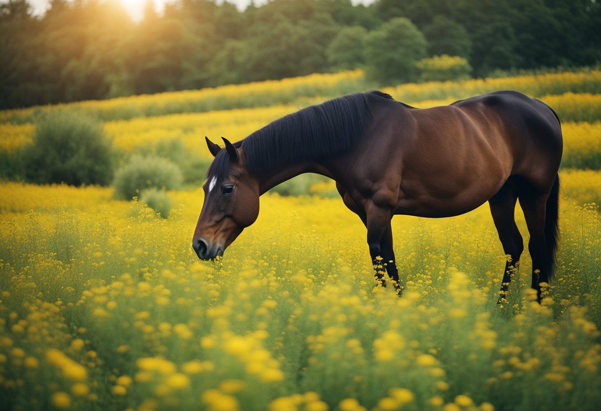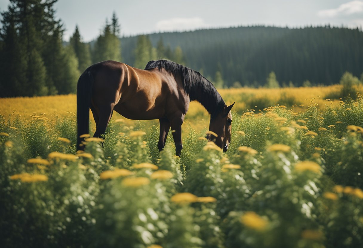 En hest som beiter i et felt omringet av vanlige giftige planter som ryllik, smørblomster og einertrær