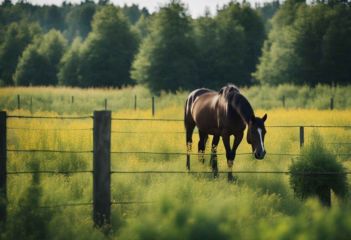 En hest som beiter i en eng med ulike giftige planter i nærheten, et advarselsskilt hengt opp på gjerdet